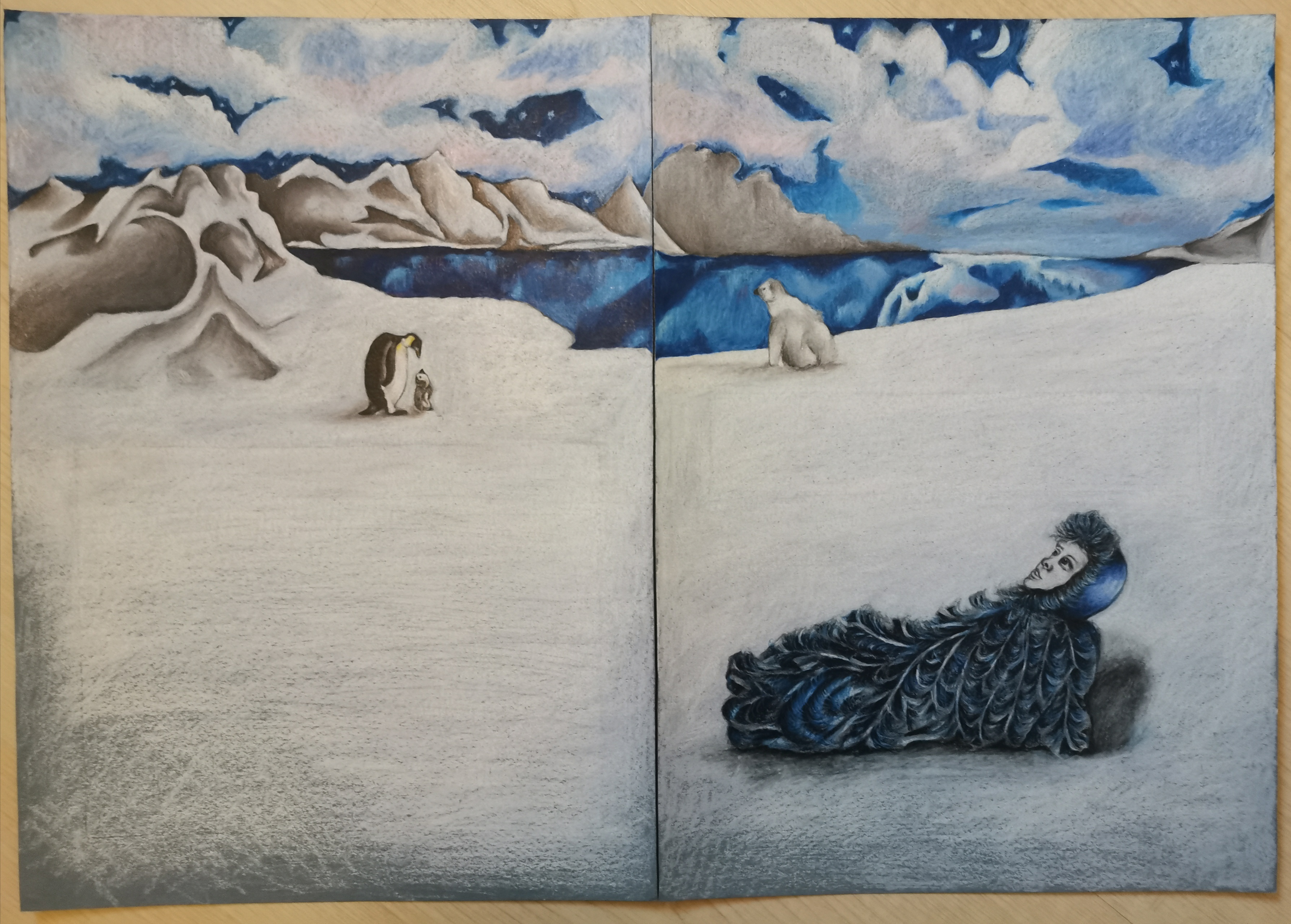 “Nino” (in his country of origin/ dans son pays d’origine), colored pencil on toned paper/ crayons de couleur sur papier bleu, size/ taille A4 each page/ chaque page