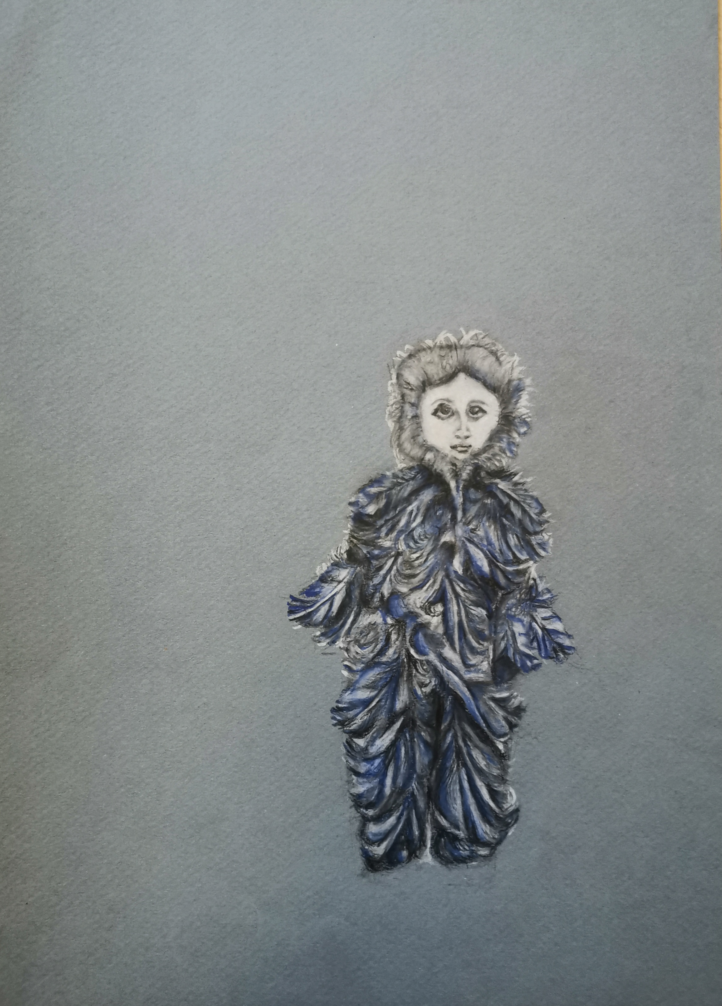 “Nino” creation sketch / sketch de création, colored pencil on toned paper/ crayons de couleur sur papier bleu, A4