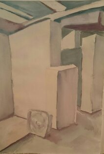 “Still life of museum objects”/ “Nature morte: objets au musée”, watercolor on paper/ aquarelle sur papier, 18 x 24 cm.